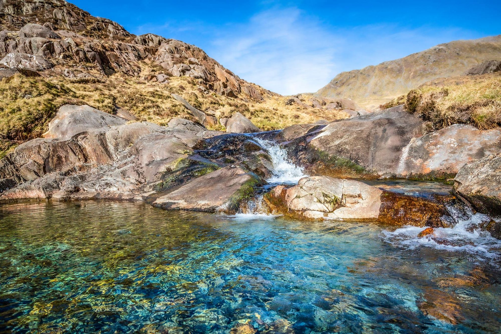 Landscape Photography of the clear, clear waters, wild swimming in North Wales & walk up Snowdon via the Watkin Path.